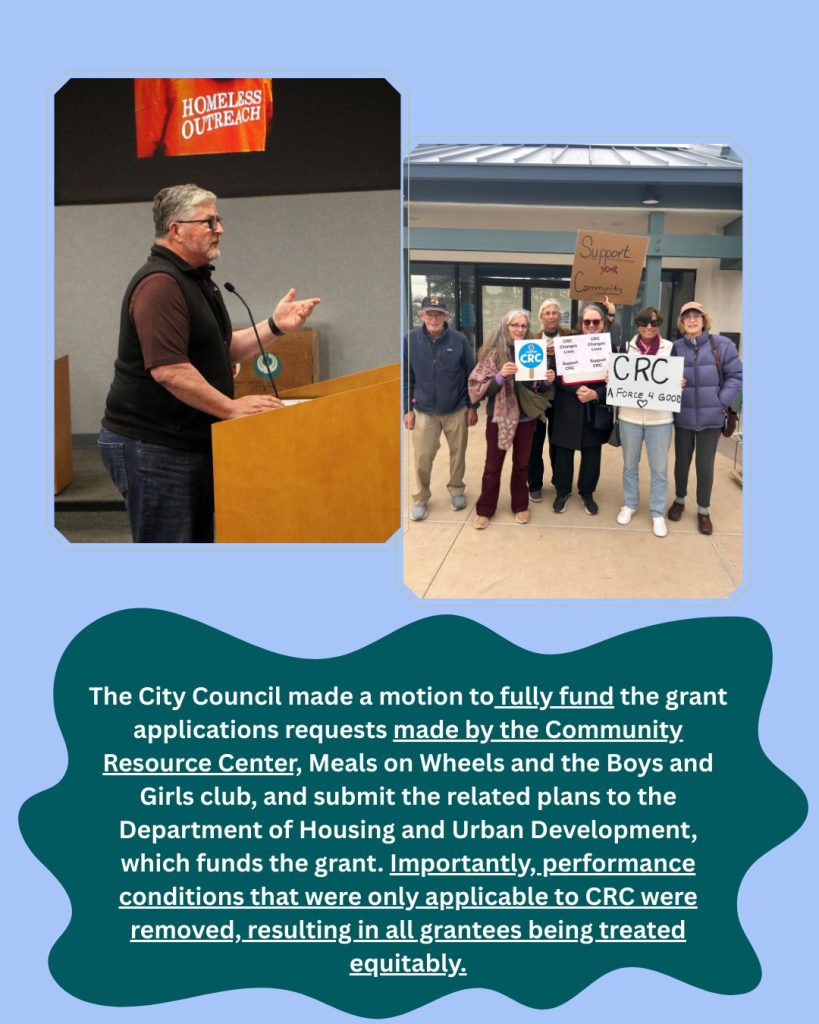 The City Council unanimously supports CRC! At Wednesday’s meeting, the Encinitas City Council finally and officially showed support for the Community Resource Center (CRC), rather than blaming them for attracting unruly unhoused people to Encinitas. In a unanimous 4-0 vote, they approved the CRC’s $30,000 grant application without the restrictions that were previously proposed.
