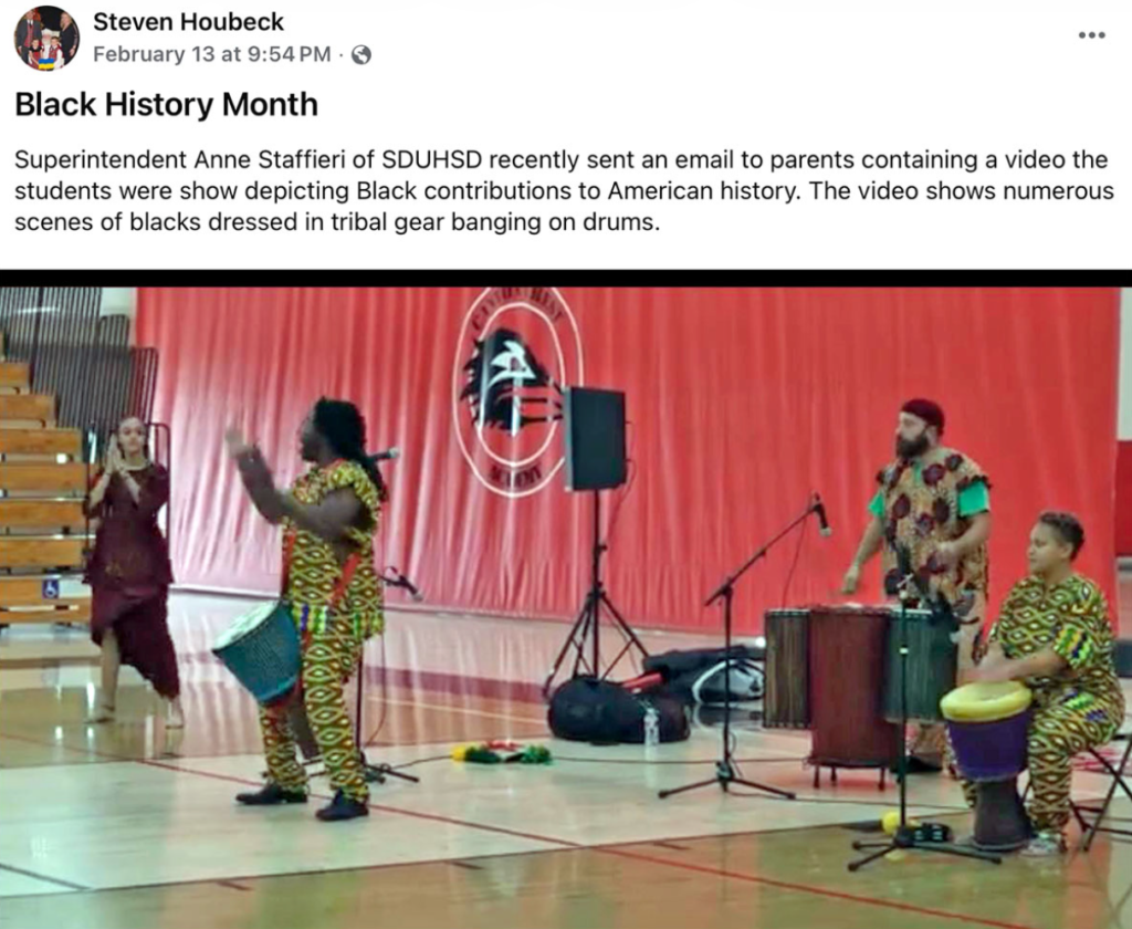 After a Black History Month performance by the Encinitas West African Dance and Drum Community at a local school, Houbeck described the performers on Facebook as “blacks banging drums dressed in tribal gear,” reducing them to crude stereotypes and treating African cultural expression as something primitive and disposable.